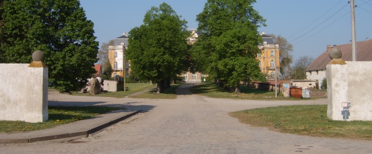 ![]() Abb. 1: Der Eingang zum Wirtschaftshof mit den beiden Kugelsonnenuhren auf den Pfeilern und der Lindenalle zum Schloss im Jahre 2007. |