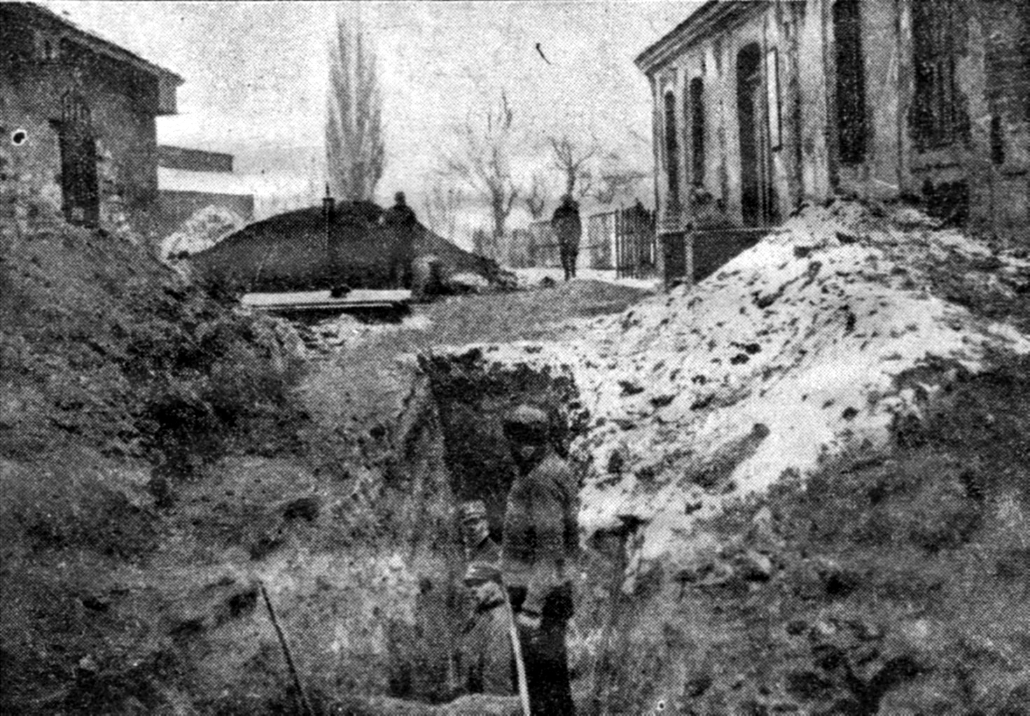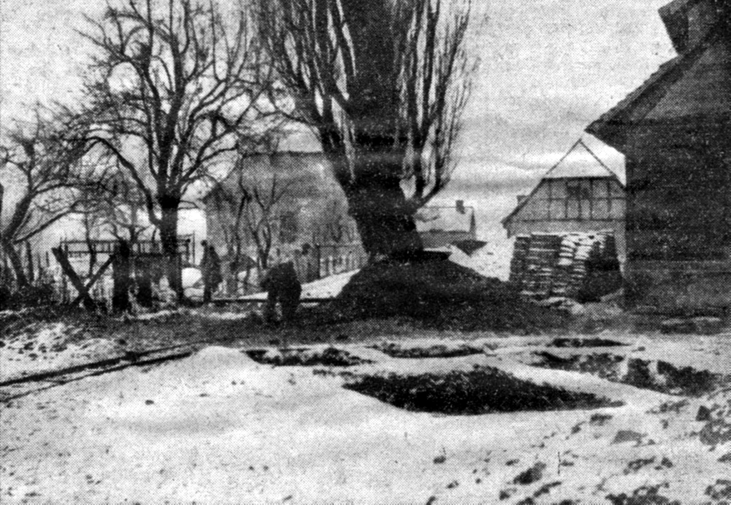 | Abb. 11 und 12: Der Dornburger Kantor Ulrich fügt seiner Dorfchronik einige Fotos bei (Abb. 1-7 und 9-12), die ihm „für getätigte Mithilfe freundlichst übermittelt wurden.“10 Auf den Fotos vom Beginn der Grabung im Januar 1933 ist gut zu erkennen, dass nur zwischen den Gebäuden der Ziegelei gegraben werden konnte. | |