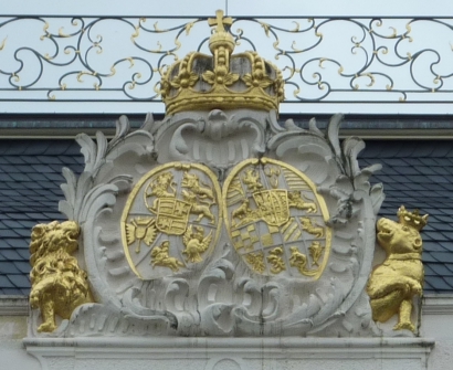 | In hervorgehobener Position, hoch auf dem Mittelrisalit, wurden am Dornburger Schloss die beiden Wappenteile vertauscht. So verkünden sie die Hochzeit von Karl Peter Ulrich (Herzog zu Holstein) und Sophie Friederike Auguste (Prinzessin zu Anhalt), die damaligen russischen Thronfolger Peter III. und Katharina II. | ![]() |