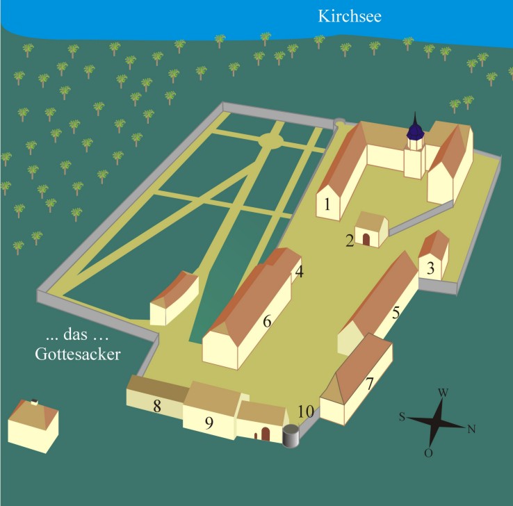 | (1) der alte und Kirchflügel | (6) alte Scheune |