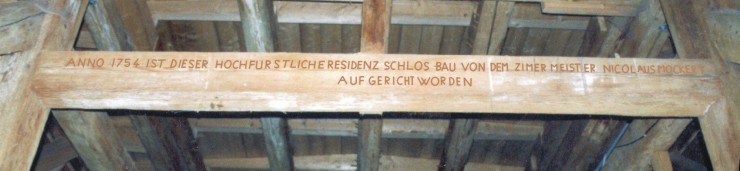 | Ab. 1: Balkeninschrift am "hängenden Gewölbe" des Mittelpavillons. Wegen der schlechten Lichtverhältnisse (oder meiner billigen Fotoausstattung) musste ich (S. Schüler) die Schrift etwas nachbessern. | |
