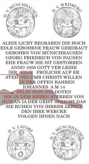 Ein zweiter Stein liegt unter der Treppe zur 1. Empore in der Nordostecke der Kirche. Die angebrachten Wappen lassen vermuten, dass die Verstorbene12 ein Kind von Hilmar Ernst von Münchhausen mit Magdalena von Wrisberg war. Die Großeltern wären dann Statius III. von Münchhausen und Anna von Lattorff. Der auf dem Stein genannte Ehemann stammt aus dem mansfeldischen Geschlecht derer von Pausen, auch von Buß, Boß, Busse oder Bausen genannt.13 |