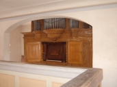 ein (siehe unten). Beim Schlossbrand am 28. Juli 1750 muss die Kirche in Mitleidenschaft gezogen worden sein, blieb aber vorerst noch nutzbar. Als schließlich 1755 der Neubau an der heutigen Stelle begann, wurde hier der größte Teil des alten Inventars integriert, natürlich auch das teure Musikinstrument, weswegen mit dem Orgelbauer Gottfried Leuschner aus Dessau verhandelt wurde. Dieser versprach für 85 Reichstaler, "das werck wieder aufzusetzen … und complet zu machen, … wobey ihm die an der alten Orgel daselbst anoch vorhanden Materialien ausgehändiget werden sollen."7 Für erforderliche Neuanschaffungen wurden ihm weitere 30 Taler bewilligt.7 Aufgrund dieser geringen Summe, bei relativ hohen Preisen für Holz und Metall, kann es sich nur um die Zweitaufsetzung des alten Instruments gehandelt haben. Bei seinem ersten Besuch in Dornburg stellte Leuschner fest, dass "das Gehäuße um die Orgel gänzlich ruinieret sey"7 und ersetzt werden muss. Gleichzeitig fragte er bei der Bauherrin an, ob "noch eine angenehme Trompeten Stimme sollte hinnein gemacht werden, weil vormahliger Orgelbauer Sperling noch darzu Plaz gelassen."7 Diese Pfeifen und das zugehörige Pedal fehlten also noch immer und wurden auch jetzt nicht hinzugefügt. Bei der Überprüfung durch den Zerbster Organisten Heynicke am 29. September 1756 wurden einige Fehler am Instrument festgestellt und später behoben. Außerdem führte der Musiker an, "daß über der Orgel, wo man nach den Belgen hinauf geht, eine Fall Thür zu machen sey, maßen sonst der Schall durch die daselbst befindliche Oefnung gehen würde, und wäre diese Fall Thüre währenden Spielen jederzeit fest zuzuhalten."7 Der nötige Wind wurde also ursprünglich auf dem Dachboden erzeugt. Da der Fürst Friedrich August von Anhalt-Zerbst (1734-1793) 1758 aus seinem Land geflohen war, fand die Einweihung der Kirche ohne die Landesherrschaft statt. Auch nach Beendigung des Siebenjährigen Krieges (1756-1763) kehrte er nicht zurück, was zu Korruption und wirtschaftlichem Niedergang führte. 1776 ließ er verkünden, dass ab jetzt auch im Schloss ein Gottesdienst abgehalten werden soll, wo man einen Raum für sakrale Zwecke hergerichtet hatte. Nun verzeichnet das Dornburger Kirchenrechnungsbuch von 1778-1798 jährlich 1 Taler und 6 Groschen für "Intereßen vor das Orgel Werk".5 Die Gemeinde musste also zahlen, weil sie das Instrument allein nutzte, welches ursprünglich zur Schloss- und Dorfkirche gehörte. Karl Ulrich arbeitete in Dornburg 1907-1964 als Kantor, bis 1951 gleichzeitig als Lehrer. In seiner Chronik schreibt er: "Ursprünglich war die Orgel nur ein Positiv mit einer ganz erschrecklich obertönigen Disposition und ohne Pedal. Erst 1856 hat Orgelbaumeister Hoff, Dessau, die Disposition in die jetzt noch bestehende umgeändert. 1864 wurde ein selbständiges Pedal hinzugefügt. 1907 bezeichnete Prof. Bartmuss, Dessau, Hoforganist und Orgelsachverständiger, die Orgel als ein 'zusammengeflicktes Werk'. Erst 1939, kurz vor Ausbruch des 2. Weltkrieges, wurde sie auf Veranlassung von Prof. Preitz, Dessau, überholt. Die fehlenden 17 klingenden Prospektpfeifen wurden eingebaut, ein neues Kastengebläse wurde angebracht und eine gründliche Reparatur und Reinigung durchgeführt. Alle Arbeiten führte Orgelbaumeister Steinmann, Dessau, aus mit einem Kostenaufwand von 270,00 Reichsmark."8 Seit 2010 wurde das Instrument in der Werkstatt von Reinhard Hüfken in Halberstadt aufgearbeitet und am 8. Juli 2012 in Dornburg wiedereingeweiht. Orgelkonzert zur Wiedereinweihung der Orgel am 8. Juli 2012